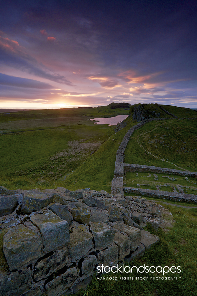 Hadrians Wall, Mile Castle 39 near Steel Rigg, Northumberland, England. Looking towards Mile Castle 39 with the sun rising across the wall stretching out before you. 2 of 3.